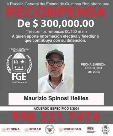 La Fiscalía General de Quintana Roo (FGE) ofrece 300 mil pesos a quien proporcione información de Maurizio Spinosi Hellies, italiano acusado de abusar de su hija en el municipio de Benito Juárez.