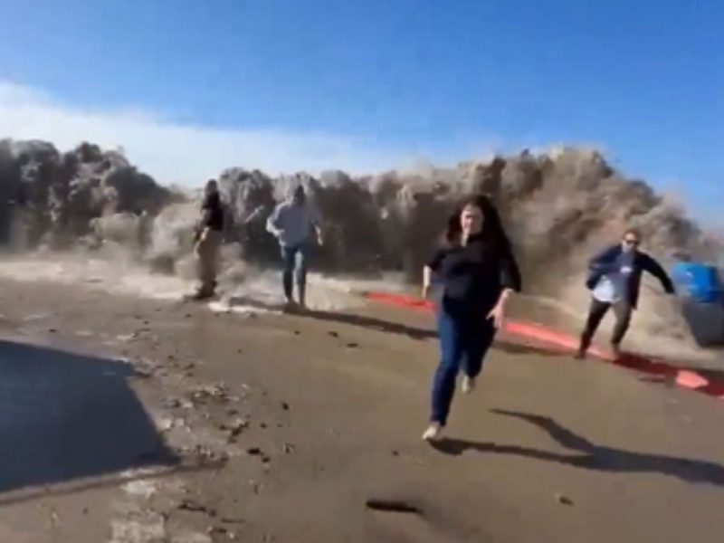 En uno de los clips difundidos en redes sociales se puede ver cómo se aproxima la ola que avanza con rapidez, razón por la cual la gente comienza a correr para alejarse lo más que puede, sin embargo, algunos terminan siendo alcanzados por ella.