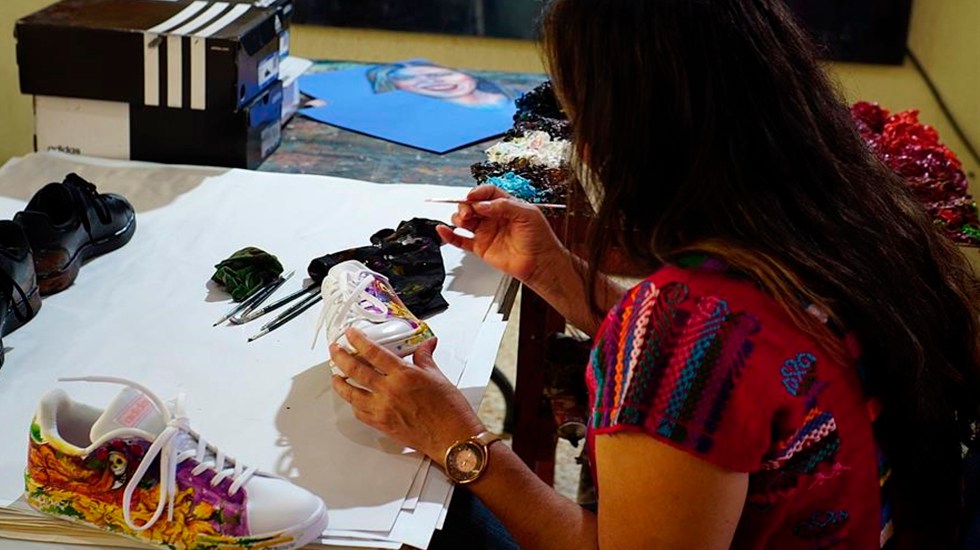 Indicó que como artista no puede permanecer quieta, mientras decora la parte lateral de un zapatilla deportiva con una oscura Catrina (la calavera mexicana de las festividades del Día de Muertos) para después rodearla de flores multicolores.