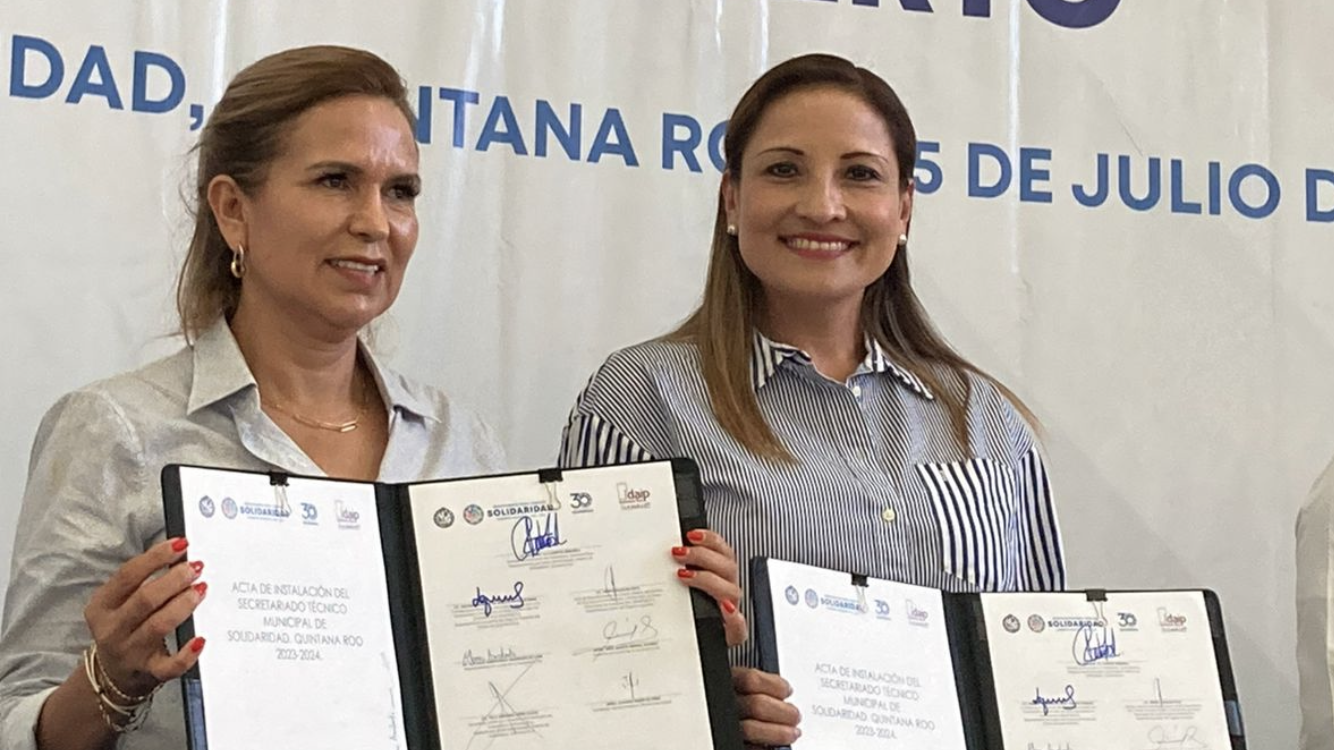 Magda Lozano Ocman, Comisionada Presidenta del Instituto de Acceso a la Información y Protección de Datos Personales de Quintana Roo (IDAIPQROO) y Roxana Lilí Campos Miranda, Presidenta Municipal de Solidaridad realizan la instalación del tercer Secretariado Técnico Municipal en Quintana Roo con la toma de protesta y entrega de nombramiento a los integrantes.