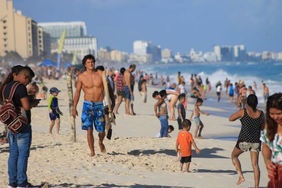 En Playa Delfines, la más popular de Cancún, locales y turistas disfrutaron del clima agradable en el Caribe mexicano tumbándose al sol y jugando con las olas. Sin embargo, a pesar de los llamados a tomar precauciones, la mayoría descartó el uso de cubrebocas a pesar de juntarse en grupos para disfrutar de alguna bebida o alimentos. Esto, a pesar de que el riesgo de contagio aún no baja lo suficiente.