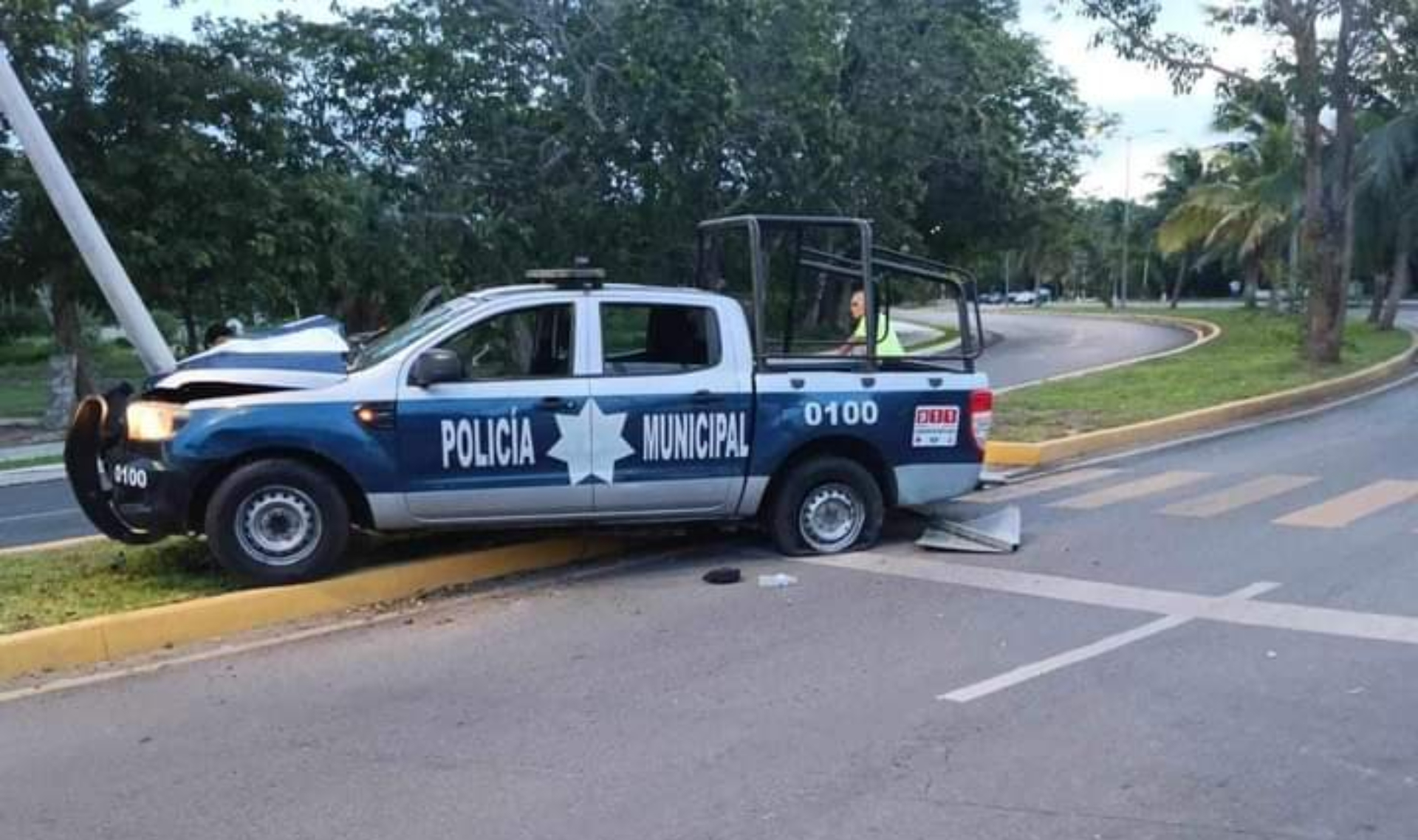 Una patrulla de la Policía Municipal de Othón P. Blanco terminó sobre el camellón central y derribó un poste de luz en el Boulevard Bahía de Chetumal, frente a la MegaEscultura.