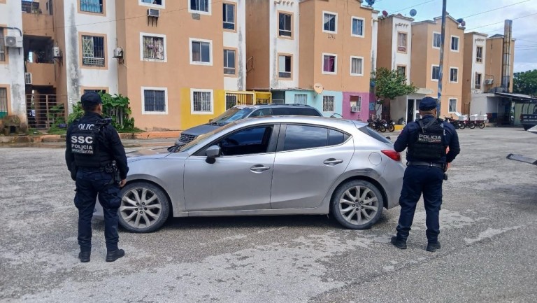En ese momento, el conductor salió corriendo hasta perderse de vista entre los edificios. Se procedió a la inspección del vehículo de la marca Mazda, de color gris, con placas de circulación de Quintana Roo, mismo que presentaba raspaduras en la parte de abajo de la facia delantera y desprendimiento de la misma.