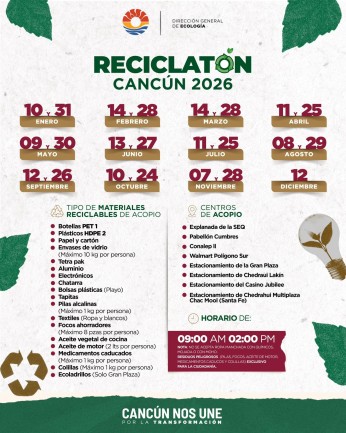Cancún, Q. R., a 07 de enero de 2026.- El Ayuntamiento de Benito Juárez, a través de la dirección de Ecología Municipal, emitió su calendario del programa “Reciclatón Cancún 2026”, con 23 jornadas en total para todo el año, siendo la primera este sábado 10 de enero en la que recibirán los materiales reutilizables de la comunidad en general.