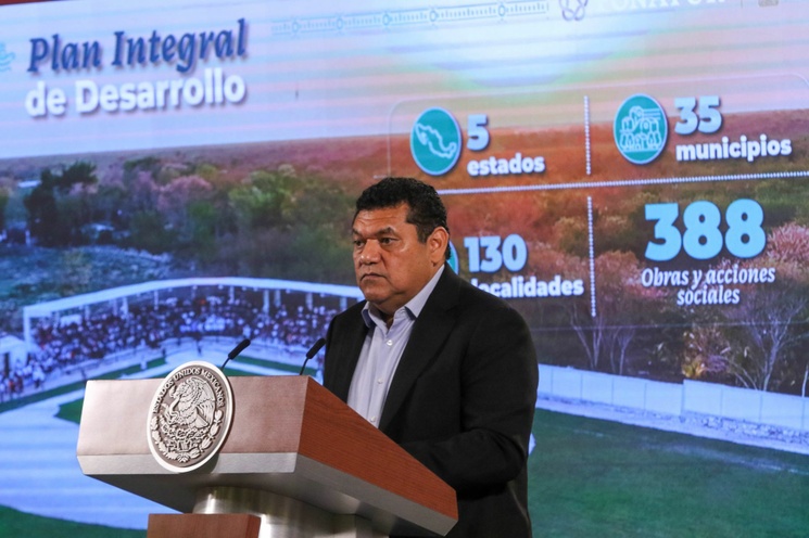 El titular de Fonatur y responsable del Tren Maya, Javier May, presentó los avances en la aplicación del Plan Integral de Desarrollo en torno a la ruta del Tren Maya que implican la realización de 388 obras en 35 municipios de los cinco estados por donde correrá esta vía.