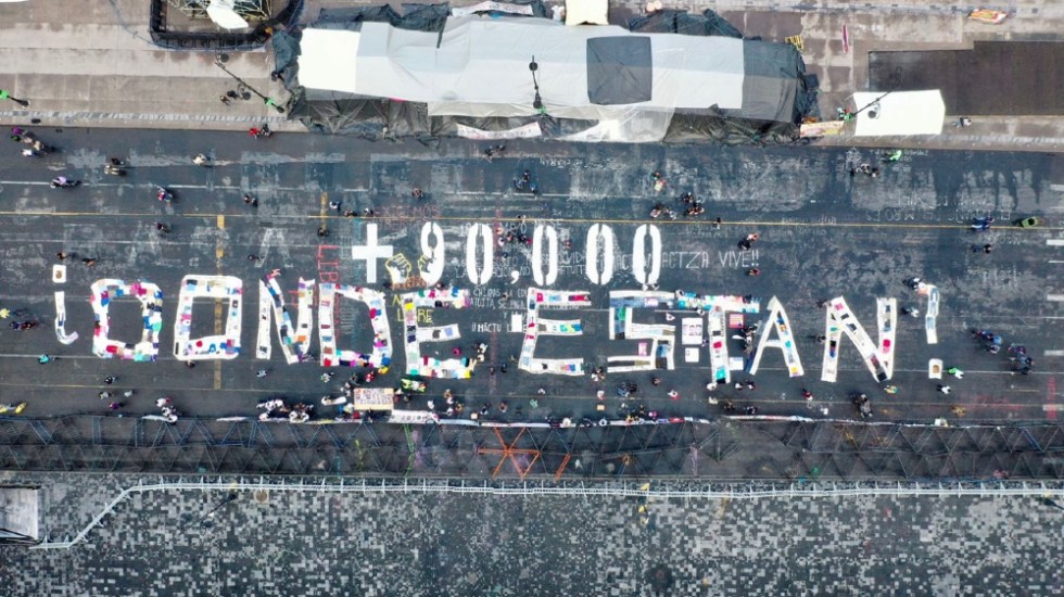 Los integrantes de colectivos pintaron en el Zócalo de la Ciudad de México la cifra de 90 mil desaparecidos, además de la pregunta “¿Dónde están?”.
