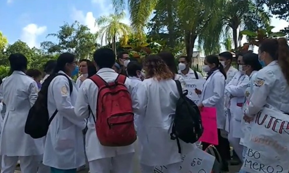 Decenas de pasantes de medicina se manifestaron a fuera de la clínica del IMSS, donde también denunciaron que carecen de equipo de protección para atender a los pacientes Covid-19; además demandan seguridad para sus compañeros que trabajan en comunidades rurales y que han perdido la vida por falta de equipo.