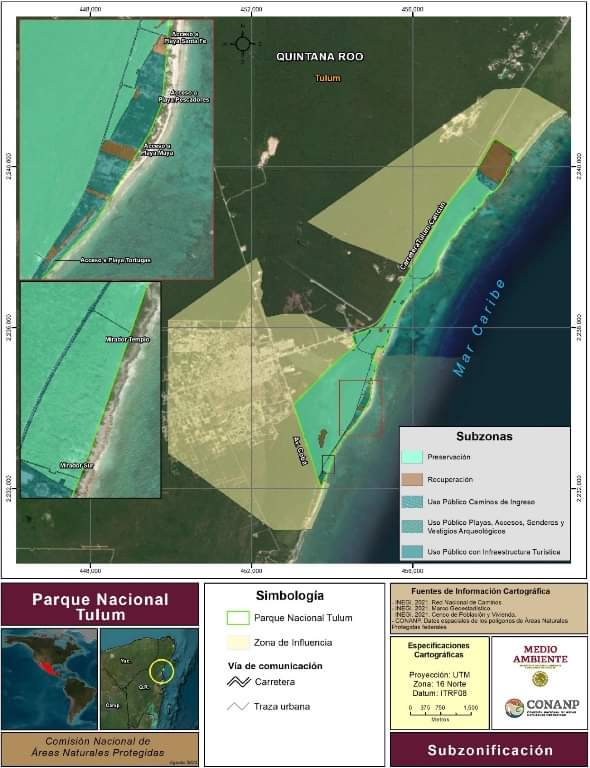 El Programa de Manejo del Parque Nacional Tulum delimita cinco subzonas con diferentes criterios de manejo, desde preservación hasta recuperación.