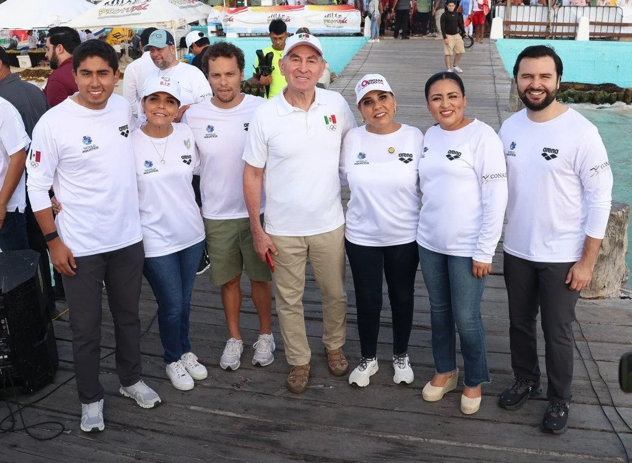 La presidenta municipal de Puerto Morelos Blanca Merari Tziu Muñoz acompañó a la gobernadora Mara Lezama a dar en pitazo de salida a los 624 nadadores que participan en el Campeonato Nacional de Aguas Abiertas, certamen que sirvió como Selectivo Nacional y Clasificatorio para la Olimpiada Nacional CONADE 2025.