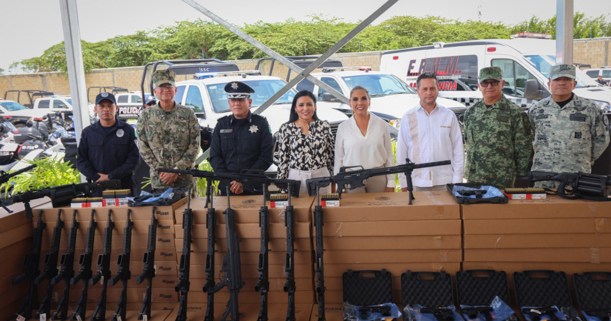En ese marco, la Alcaldesa recibió de manera simbólica de la gobernadora Mara Lezama el armamento que corresponde a Puerto Morelos –613 armas largas y cortas con registro de la Secretaría de la Defensa Nacional (Sedena) y municiones–, que permitirá reforzar la capacidad de respuesta de las corporaciones de Seguridad Pública de los 11 municipios, cuya inversión asciende a más de 20 millones de pesos.