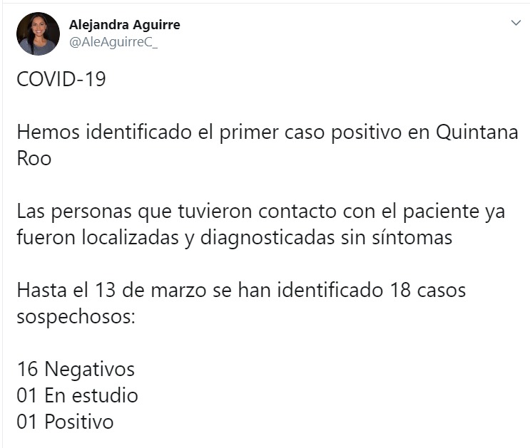 “COVID-19 Hemos identificado el primer caso positivo en Quintana Roo Las personas que tuvieron contacto con el paciente ya fueron localizadas y diagnosticadas sin síntomas Hasta el 13 de marzo se han identificado 18 casos sospechosos: 16 Negativos 01 En estudio 01 Positivo”, se puede leer en el tuit de la titular de Salud.