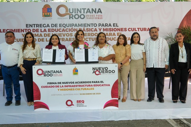 En el mismo evento realizado en la Plaza Cívica de la Secretaría de Educación, en el marco del Nuevo Acuerdo por el Bienestar y Desarrollo de Quintana Roo, se firmaron dos convenios, uno a favor de impulsar el desarrollo educativo para el mantenimiento de la infraestructura de las escuelas públicas de educación básica y otro con el propósito de impulsar la capacitación en artes y oficios de las Misiones Culturales de la entidad.