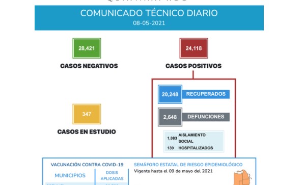 De acuerdo con el reporte diario que elabora SESA, hasta el 08 de Mayo de 2021, se han notificado 2 mil 648 defunciones y 24 mil 118 casos positivos, mientras que 20 mil 248 personas ya se recuperaron, 28 mil 421 casos fueron negativos , los casos en estudio son 347 y 4 defunciones.