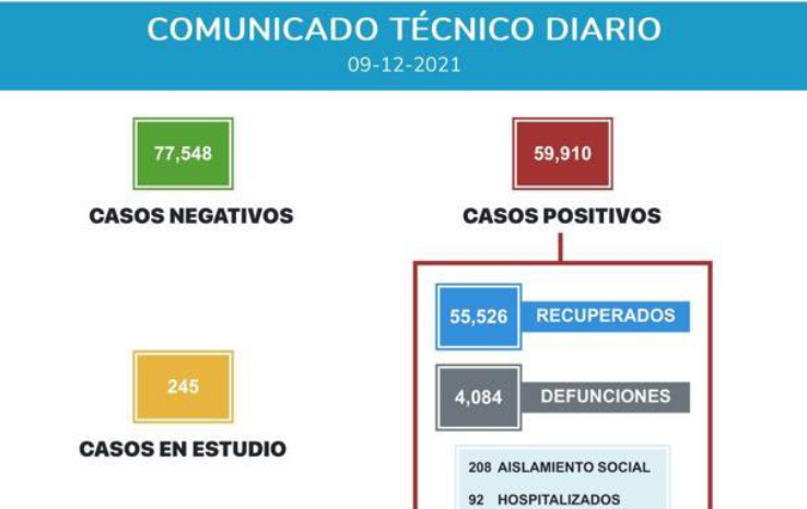 De acuerdo con el reporte diario que elabora SESA, hasta el 09 de diciembre de 2021, se han notificado 4 mil 084 defunciones y 59 mil 910 casos positivos, mientras que 55 mil 526 personas ya se recuperaron, 77 mil 548 casos fueron negativos, los casos en estudio son 245.