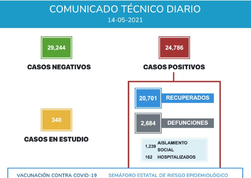 De acuerdo con el reporte diario que elabora SESA, hasta el 14 de Mayo de 2021, se han notificado 2 mil 684 defunciones y 24 mil 786 casos positivos, mientras que 20 mil 701 personas ya se recuperaron, 29 mil 244 casos fueron negativos , los casos en estudio son 340 y 7 defunciones.
