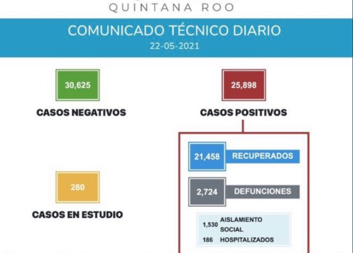 En el balance que dieron a conocer hoy sábado 22 de Mayo, las autoridades quintanarroenses de salud se indica que 1,530 personas se encuentran en aislamiento social y 186 hospitalizadas, dando un total de 1,716.