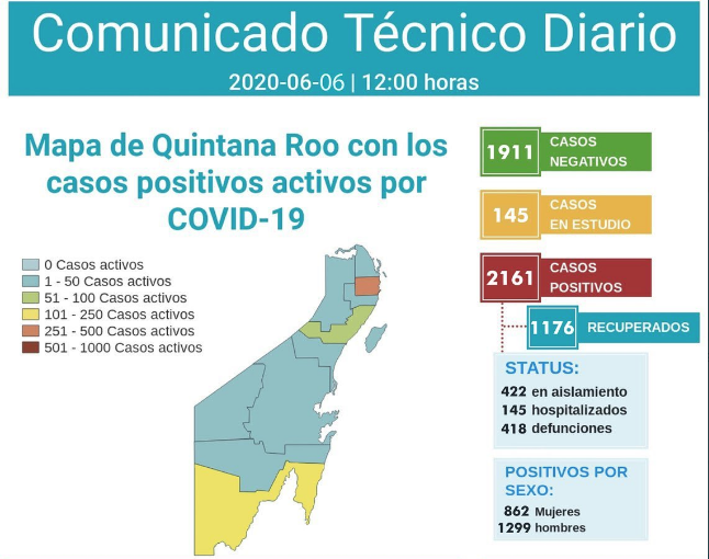 El número de decesos paso de 407 a 418, es decir que se registraron 11 nuevas muertes: seis en Benito Juárez; tres en Solidaridad; una en Othón P. Blanco y una en Puerto Morelos.