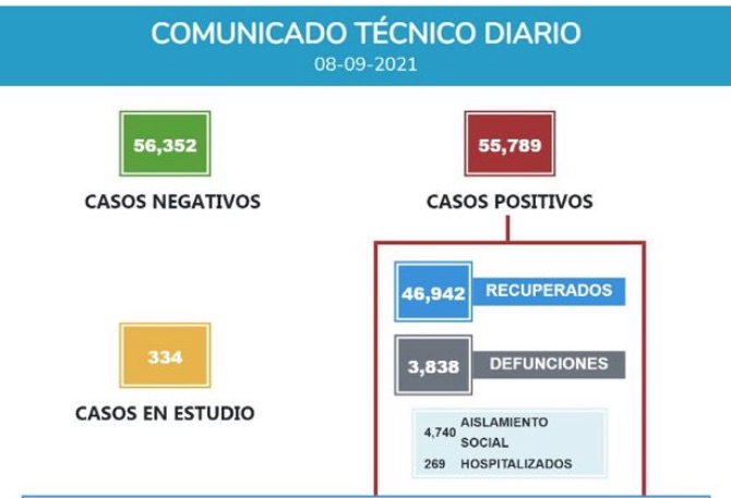 De acuerdo con el reporte diario que elabora SESA, hasta el 08 de septiembre de 2021, se han notificado 3 mil 838 defunciones y 55 mil 789 casos positivos, mientras que 46 mil 942 personas ya se recuperaron, 56 mil 352 casos fueron negativos, los casos en estudio son 334.