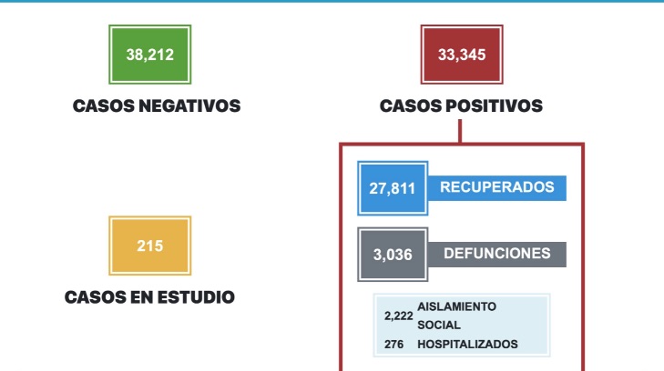 De acuerdo con el reporte diario que elabora SESA, hasta el 01 de julio de 2021, se han notificado 3 mil 036 defunciones y 33 mil 345 casos positivos, mientras que 27 mil 811 personas ya se recuperaron, 38 mil 212 casos fueron negativos, los casos en estudio son 215.