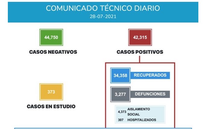 De acuerdo con el reporte diario que elabora SESA, hasta el 28 de julio de 2021, se han notificado 3 mil 277 defunciones y 42 mil 315 casos positivos, mientras que 34 mil 358 personas ya se recuperaron, 44 mil 750 casos fueron negativos, los casos en estudio son 373.