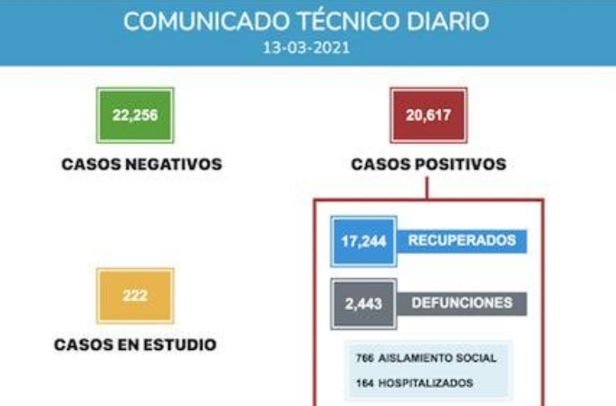 De acuerdo con el reporte diario que elabora SESA, hasta el 13 de marzo de 2021, se han notificado 2 mil 443 defunciones y 20 mil 617 casos positivos, mientras que 17 mil 244 personas ya se recuperaron, 22 mil 256 casos fueron negativos y hay 222 en estudio.