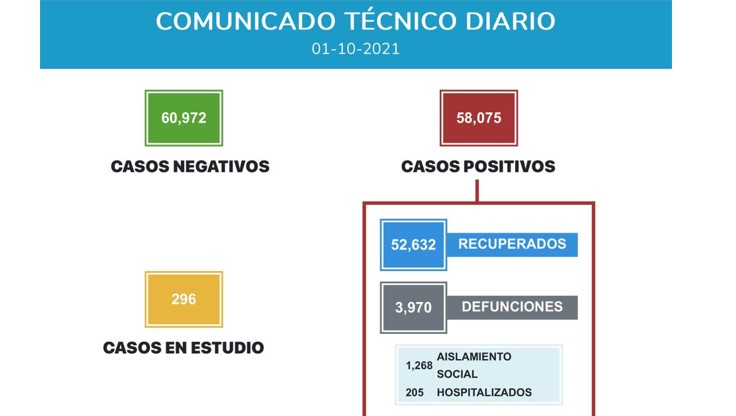 De acuerdo con el reporte diario que elabora SESA, hasta el 01 de octubre de 2021, se han notificado 3 mil 970 defunciones y 58 mil 075 casos positivos, mientras que 52 mil 632 personas ya se recuperaron, 60 mil 972 casos fueron negativos, los casos en estudio son 296.