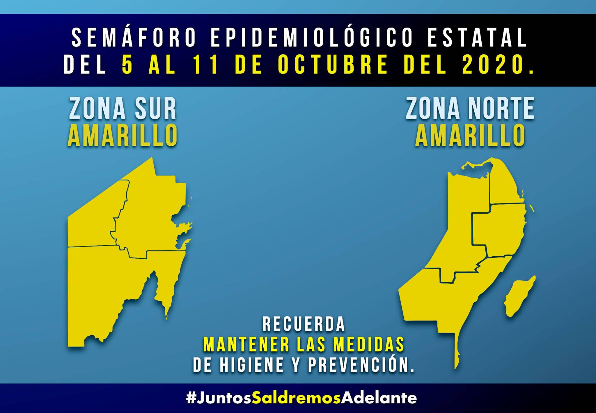 El gobernador Carlos Joaquín anunció, que el semáforo epidemiológico estatal del 5 al 11 de octubre se mantiene en el color amarillo en todo Quintana Roo.