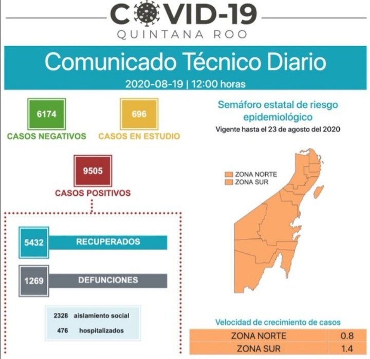 Luego del reporte de 109 casos positivos en el estado de Quintana Roo en las últimas 24 horas, cifras emitidas en el informe diario de la Secretaría de Salud, se elevan a un total de 9 mil 505, con un incremento de decesos de 25 ocurridos hasta el día de hoy miércoles 19 de agosto del año en curso.
