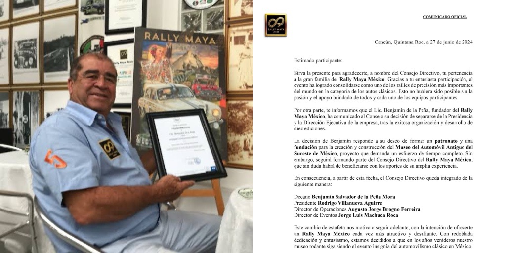 Benjamín de la Peña, fundador y figura clave en la consolidación del Rally Maya México, ha liderado el evento durante diez exitosas ediciones. Su visión y dedicación han sido fundamentales para posicionar al Rally Maya como un referente en el automovilismo de precisión, atrayendo a entusiastas y coleccionistas de autos clásicos de todo el mundo. A partir de ahora, Benjamín se enfocará en un nuevo proyecto: la creación y construcción del Museo del Automóvil Antiguo del Sureste de México. Este ambicioso proyecto demanda su atención a tiempo completo, aunque seguirá formando parte del Consejo Directivo del Rally Maya, donde sus aportes continuarán beneficiando al evento.