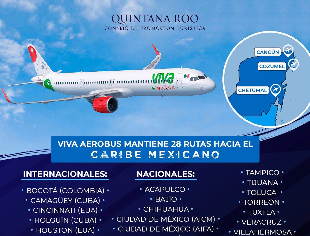 A través de sus redes sociales el CPTQ señaló que la conectividad área del Caribe Mexicano se fortalece gracias a la colaboración y trabajo en conjunto con aerolíneas como Viva Aerobus, la cual tiene 28 rutas hacia los tres aeropuertos de Quintana Roo.