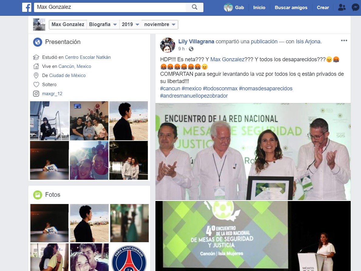 Familiares y amigos de Maximiliano González, el joven desaparecido en el club nocturno Distrito Cavana, arremeten en redes sociales contra Hermelinda Lezama, alcaldesa de Benito Juárez, tras recibir reconocimiento en el 4to encuentro de Red Nacional de Mesas de Seguridad y Justicia.
