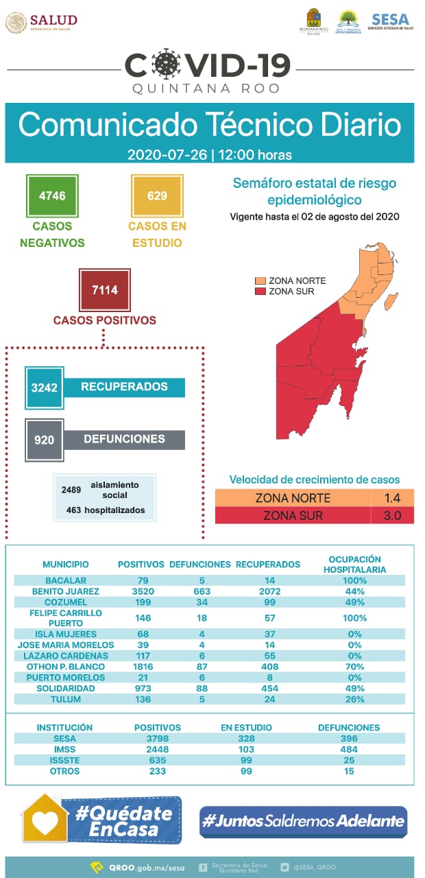 Al domingo 26 de julio Quintana Roo registra 94 nuevos contagios de COVID 19 y ocho nuevos decesos en las últimas 24 horas y un total de 2 mil 952 casos activos del virus, de acuerdo a la última actualización del comunicado técnico de la Secretaria de Salud en la entidad:
