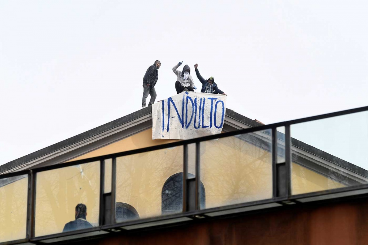 El lunes, los reclusos alzados treparon hasta el techo de la Prisión San Vittore en Milán y alzaron un cartel que decía “Indulto”.