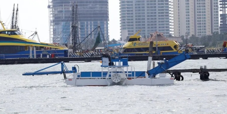 A esta embarcación se sumarán otras cuatro que la Marina construye en su astillero de Coatzacoalcos, Veracruz y tiene capacidad para recolectar hasta 80 toneladas diarias de sargazo.