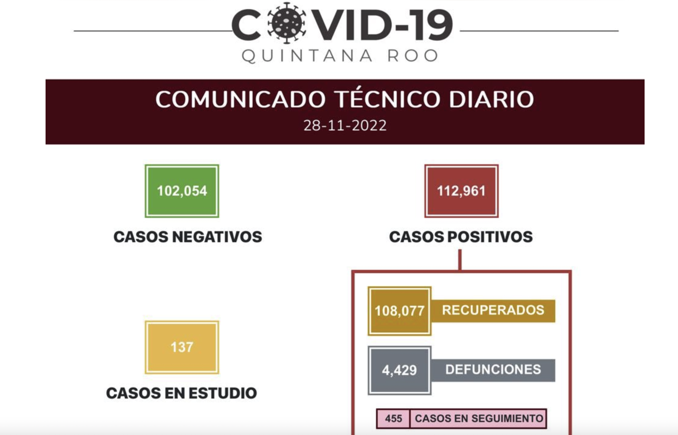 La Secretaría de Salud en Quintana Roo reportó 30 nuevos casos de Covid-19 en la entidad con lo que se acumulan 112 mil 961 casos positivos desde el inicio de la pandemia en marzo de 2020.