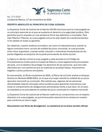 En ese sentido, el 26 de noviembre de 2025, el Pleno de la Corte analizó el Amparo Directo en Revisión 6585/2023, en el que una mujer solicitó la nulidad de un juicio ejecutivo mercantil ya concluido. Ella señaló que, algunas de las personas demandadas habrían simulado actos jurídicos para aparentar insolvencia y así evitar el cumplimiento de obligaciones alimentarias frente a sus hijos. En el caso, se estudiará si es procedente la nulidad de juicio concluido en materia mercantil.