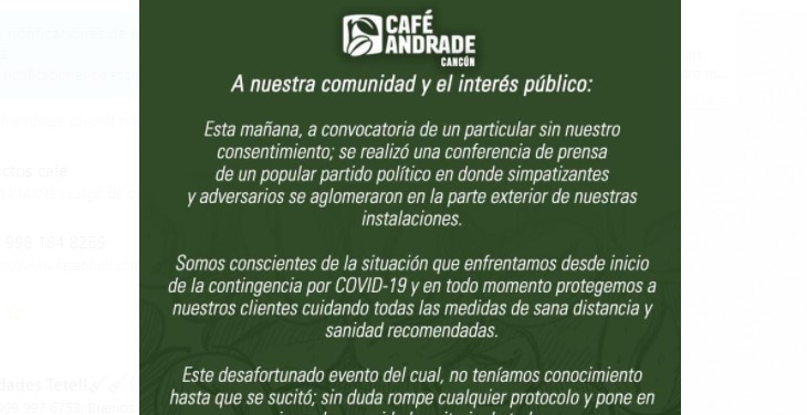 Ante las aglomeraciones de personas en tiempos de pandemia por COVID-19, la gerencia del Café Andrade en Cancún, decidieron manifestar su postura de rechazo a la convocatoria de rueda de prensa dicho partido populista y deslindándose de que nunca se les notificó del evento.