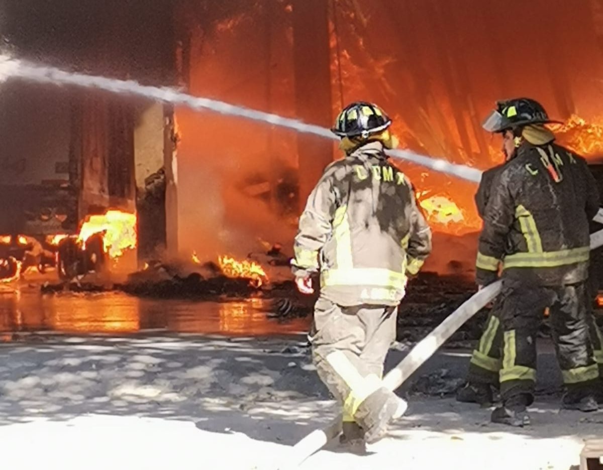 Personal del departamento de Bomberos y Protección Civil trabajan para sofocar un incendio que se registra en una fábrica de muebles ubicada en la colonia Santa Cruz de la colonia Azcapotzalco.