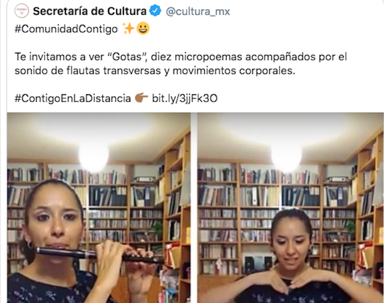 “Te invitamos a ver “Gotas”, diez micropoemas acompañados por el sonido de flautas transversas y movimientos corporales.” dice el tuit de la dependencia.