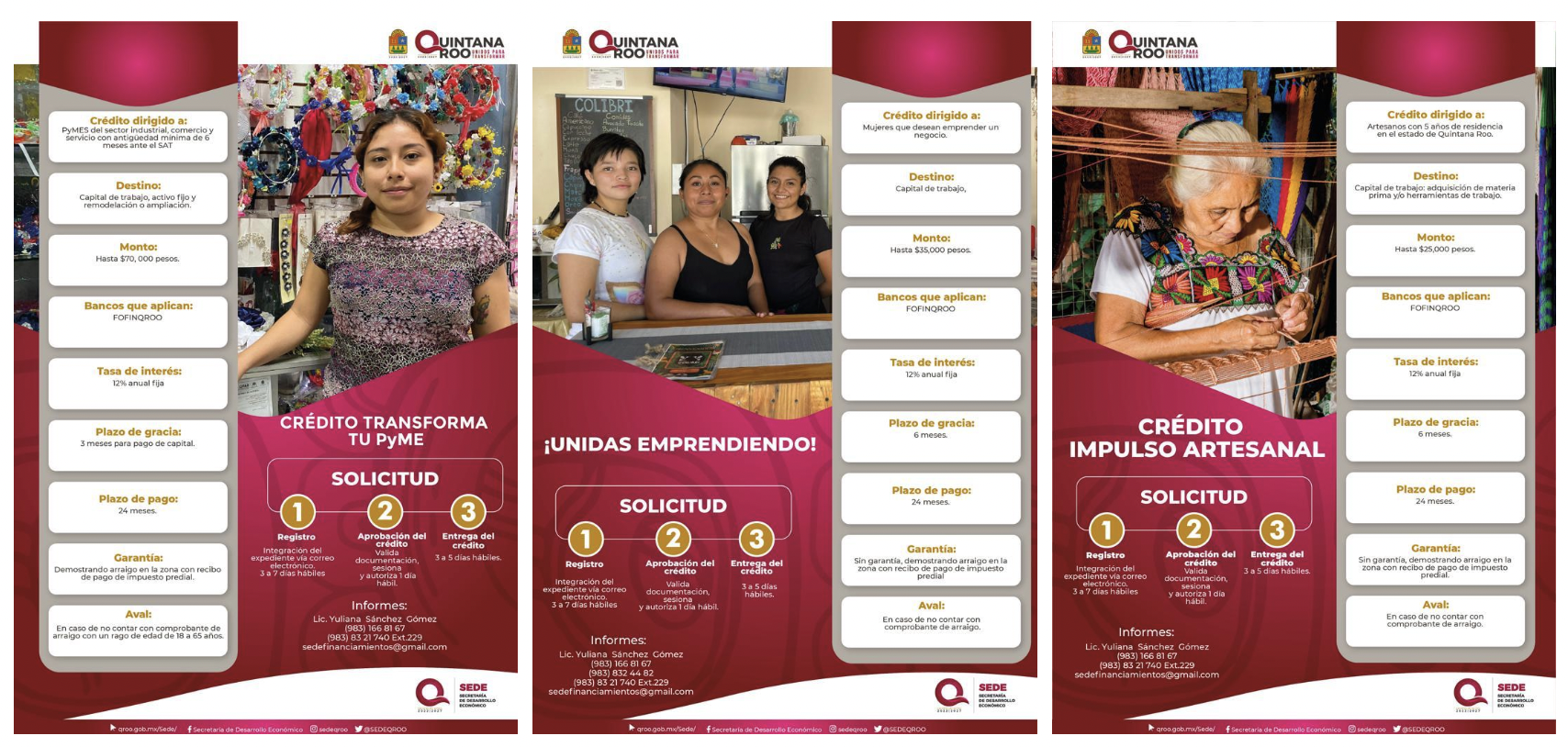 Para fortalecer el empoderamiento y la autonomía de las mujeres con actividades productivas y apoyos financieros, así como a productores y emprendedores, el Gobierno del Estado a través de la Secretaría de Desarrollo Económico promueve los programas de financiamiento: Crédito Impulso Artesanal, Unidas Emprendiendo, Crédito “Hecho en Quintana Roo”, Emprendiendo por Quintana Roo, y el Crédito Transforma tu PYME.