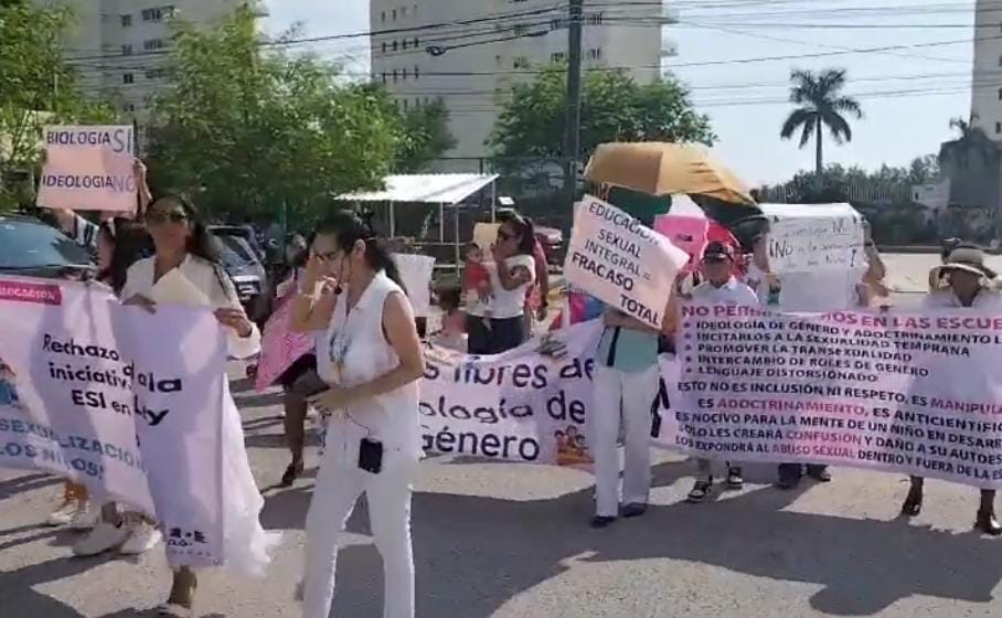 Padres de familia exigen que se retiren los libros de texto gratuitos de los planteles educativos y se manifiestan a fuera de las oficinas de la Secretaria de Educación en Quintana Roo (SEQ) en Cancún.