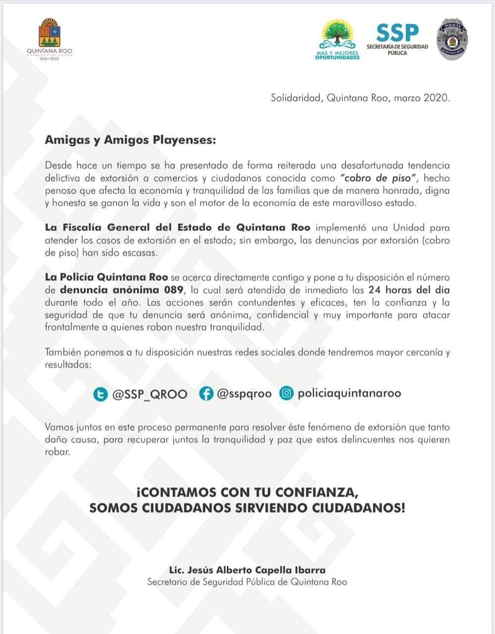 El gobierno de Solidaridad, cierra filas con la Fiscalía General de Justicia del Estado de Quintana Roo, la Policía Estatal y la Guardia Nacional, para proteger a la ciudadanía del delito de extorsión en su modalidad de “cobro de piso” que afecta a todo el país.