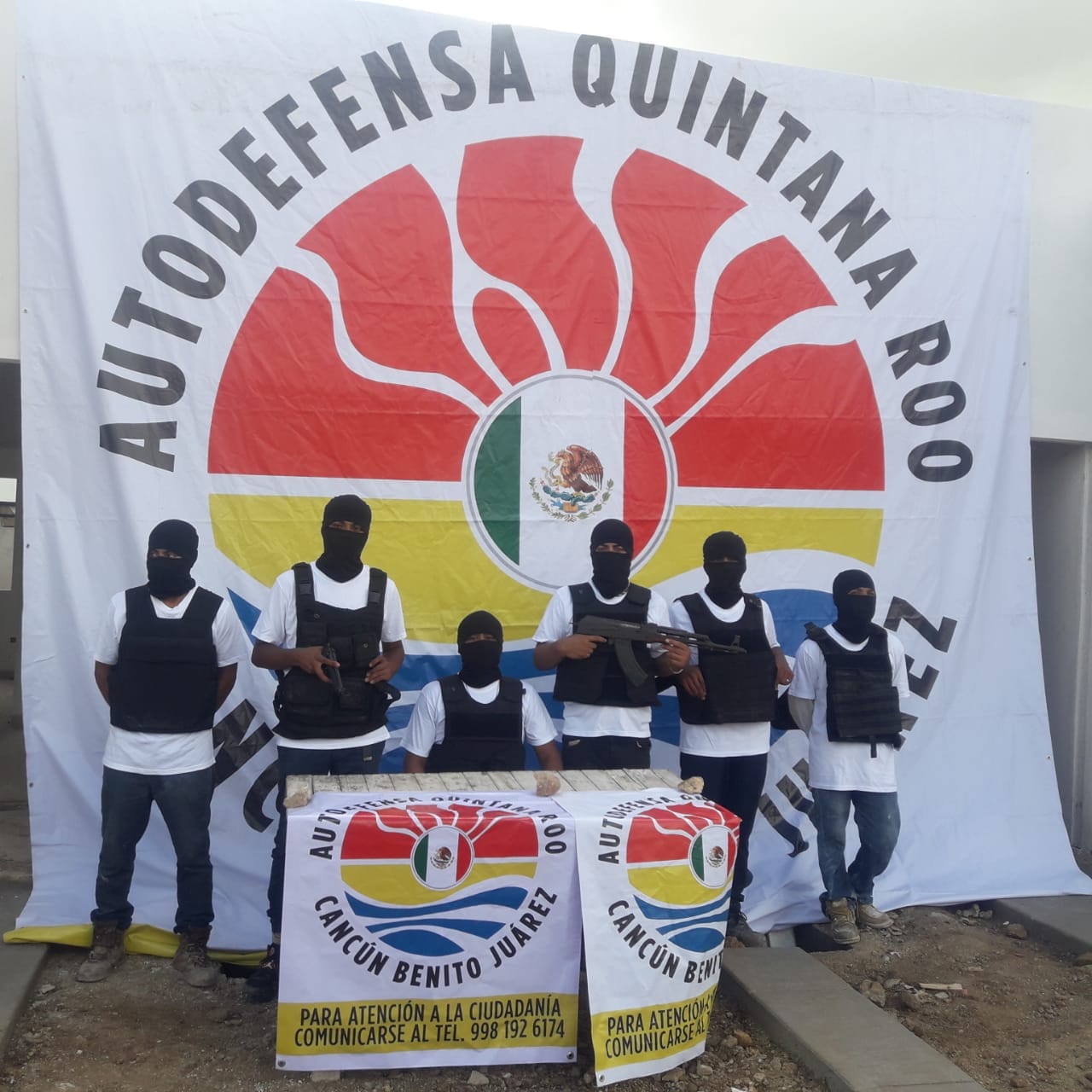 “Somos el grupo táctico-operativo de autodefensas de Quintana Roo, hacemos un llamado a todos los grupos de Cancún, comerciantes, constructoras y empresarios a que no se dejen amedrentar por esos ‘muertos de hambre’ extorsionadores que amenazan a rosti-pollos y negocios de construcciones”, señala uno de los hombres encapuchados, hablando desde detrás de una mesa, con una lona que incluye el teléfono de su agrupación.