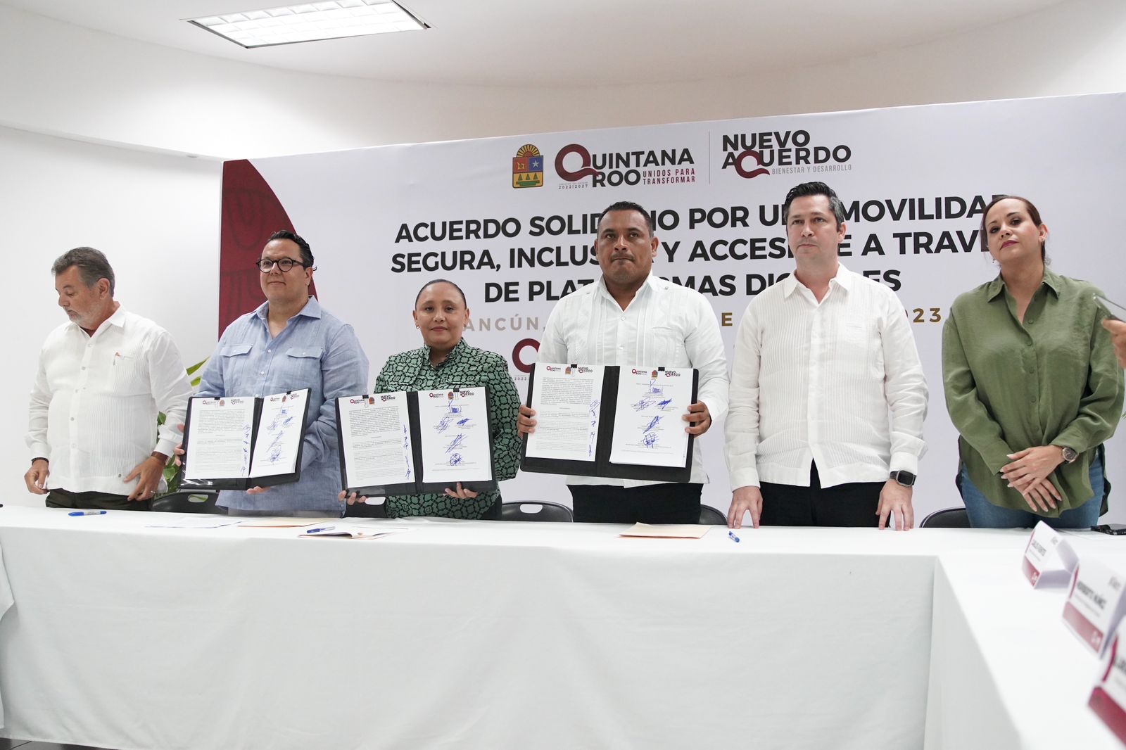 El gobierno de Quintana Roo, a través de la secretaria de Gobierno Cristina Torres Gómez atestiguó la firma de un acuerdo solidario entre el Frente Único de Trabajadores del Volante (FUTV) y la plataforma digital DiDi México, con el objetivo de respetar las reformas a la Ley de Movilidad, y para que la gente tenga mayores oportunidades para trasladarse en condiciones de seguridad, eficiencia, calidad e inclusión.
