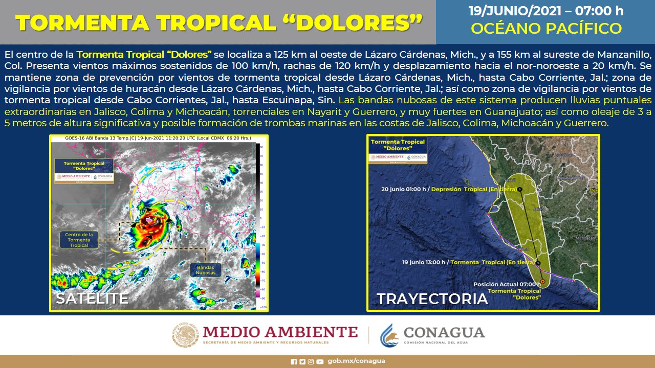 El SMN indicó que la tormenta tropical Dolores ocasionará lluvias puntuales torrenciales en Guerrero y Nayarit, y muy fuertes en Durango, Guanajuato y Sinaloa, así como rachas de viento de 90 a 110 kilómetros por hora, con oleaje de 3 a 5 metros.
