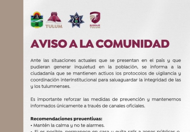 El presidente municipal de Tulum, Diego Castañón, informó a la ciudadanía que el gobierno municipal se mantiene en coordinación permanente con los niveles federal y estatal para garantizar la paz y el orden en el municipio.