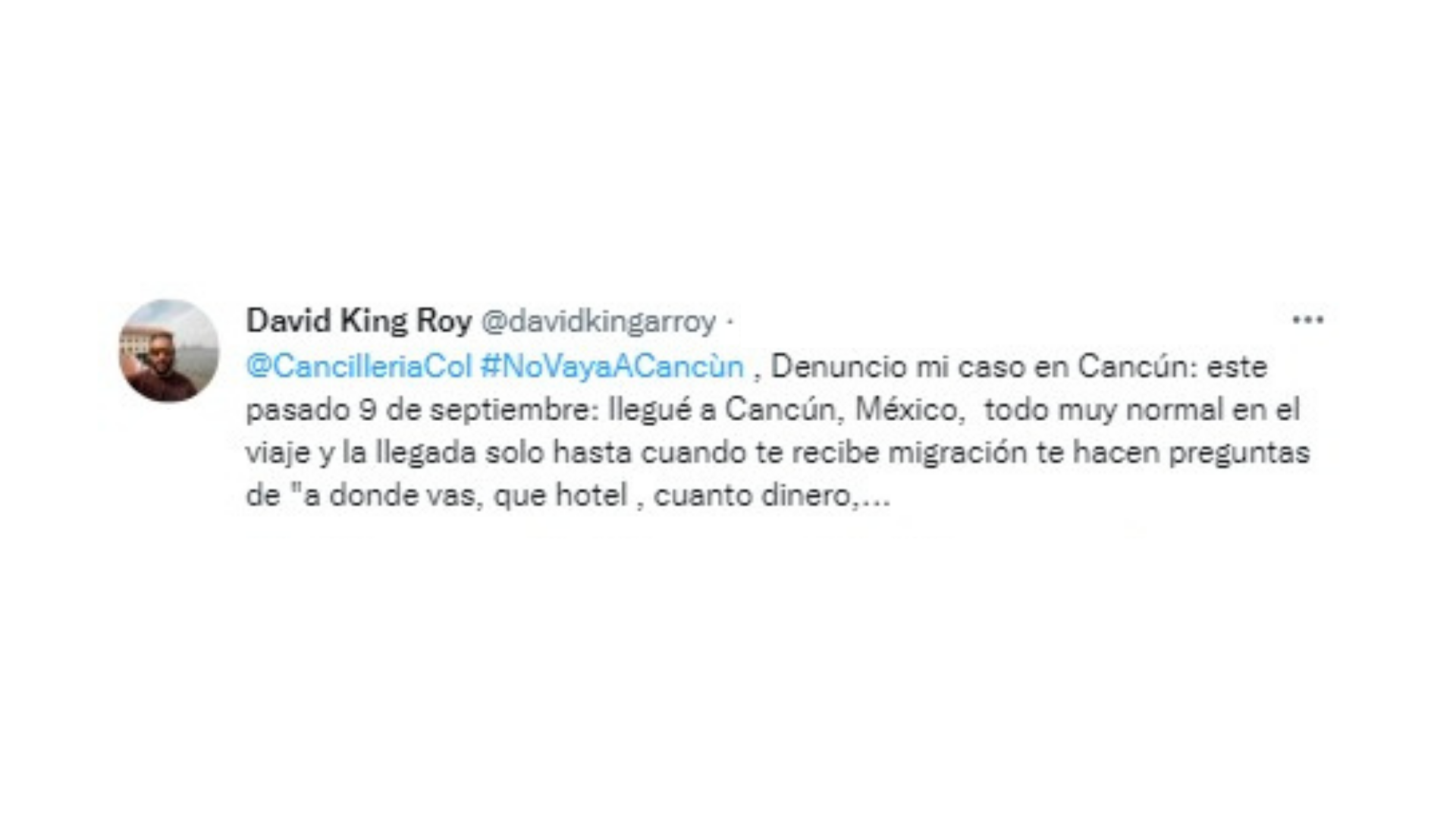 “Ya después de 24 horas, en mi caso aproximadamente a las 30 horas de haber estado allí, (en algunos casos, hasta 38 horas), nos despacharon de vuelta a nuestro país, en la misma aerolínea en que llegaste, a ellos no les importa que pierdas tu dinero del hotel porque no dejan llamar a cancelar, no les importa que pierdas el dinero de tu tour, no les importa que pierdas el dinero invertido en el viaje, solo hacen lo que se les da la gana. Los que realmente pasan son europeos en su gran mayoría, Nosotros los colombianos somos para ellos posibles migrantes a USA, ellos deben hacer bien su trabajo y para esta discriminación, lo mas increíble son las condiciones infrahumanas que te quedas en ese cuarto, aislado, separado y con tus vacaciones y dinero perdidas, lo repito de nuevo #NoVayaACancùn”, reseñó finalmente David en su hilo de Twitter.