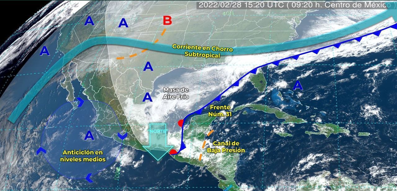 Por la entrada del frente frío 31, esta noche se espera una baja a la temperatura, misma que se se desplazará sobre la Península de Yucatán.
