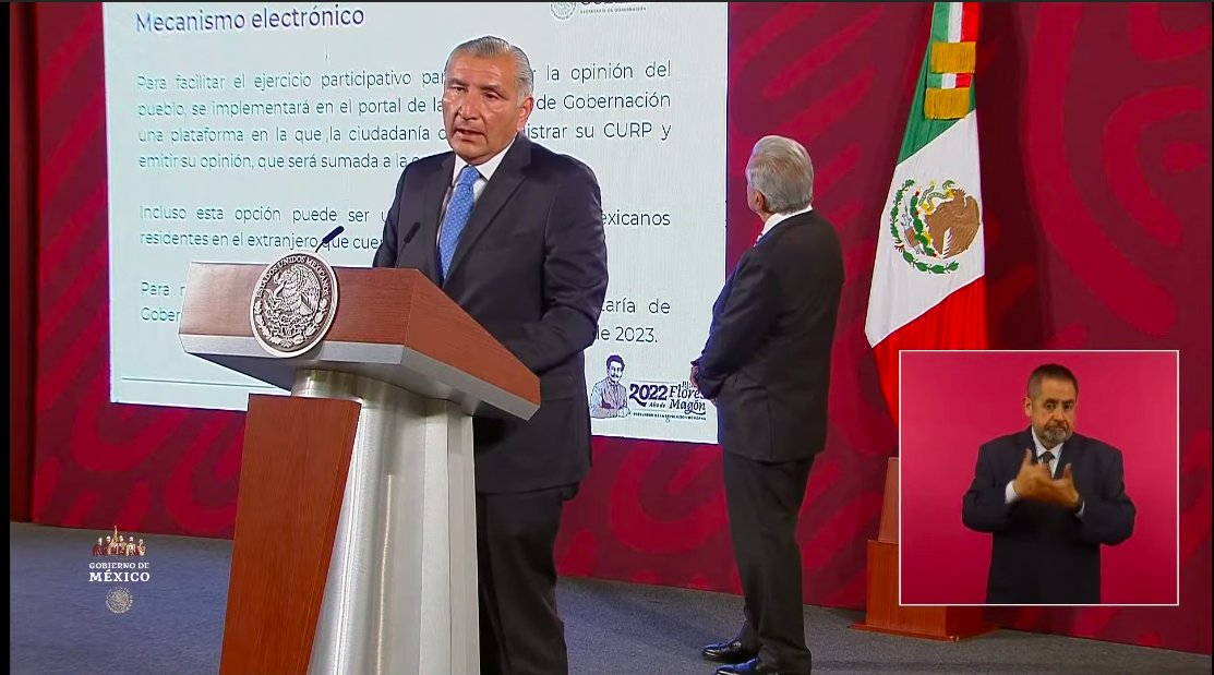 Tal como adelantó el presidente Andrés Manuel López Obrador, el secretario de Gobernación, Adán Augusto López, presentó en la conferencia mañanera el mecanismo de participación por el cual se preguntará a la ciudadanía su opinión respecto a las Fuerzas Armadas en labores de seguridad.