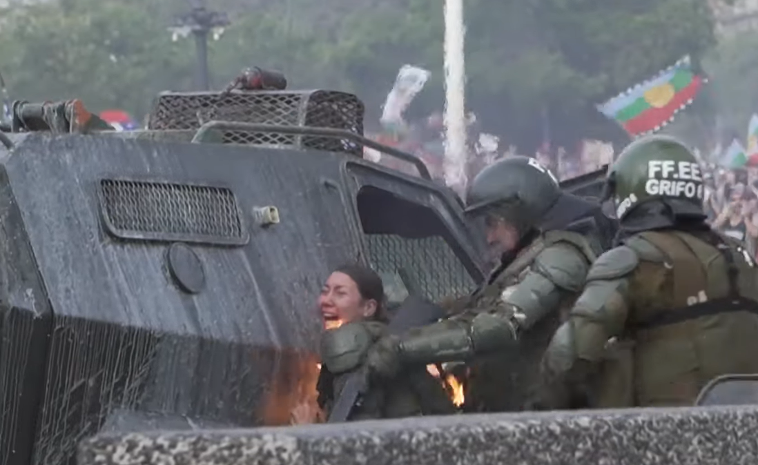 Un cóctel molotov golpea a dos policías en las protestas en Chile. Las agentes salvaron la vida gracias a la rápida actuación de sus compañeros.